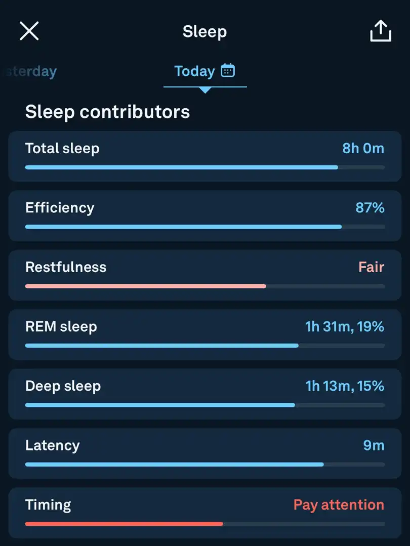 Where Oura really excels is in its sleep data. It records every nap or full night’s sleep—and it’s accurate down to the minute. Every morning, you’ll wake up to a sleep score, which is created by averaging markers such as total sleep, the amount of time you spent in each sleep stage, and how long it took you to fall asleep. When your sleep deviates from your norm, the app alerts you and gives potential explanations (like eating too close to bedtime).